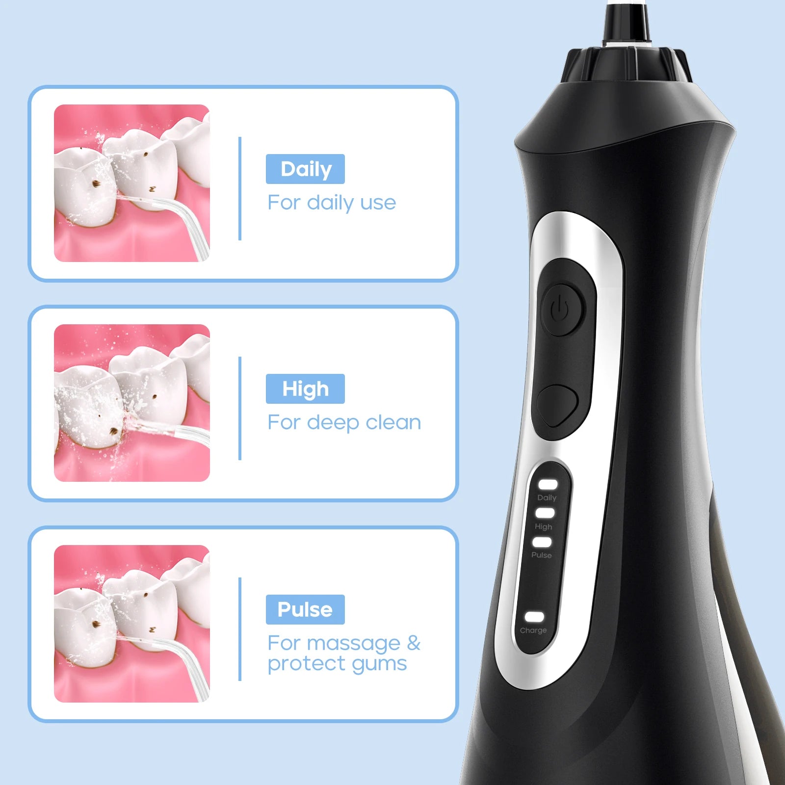- Three operating modes—Daily, High, and Pulse—with an Auto Memory Function to tailor sessions and recall your last setting, and to suit all different teeth and gum conditions.